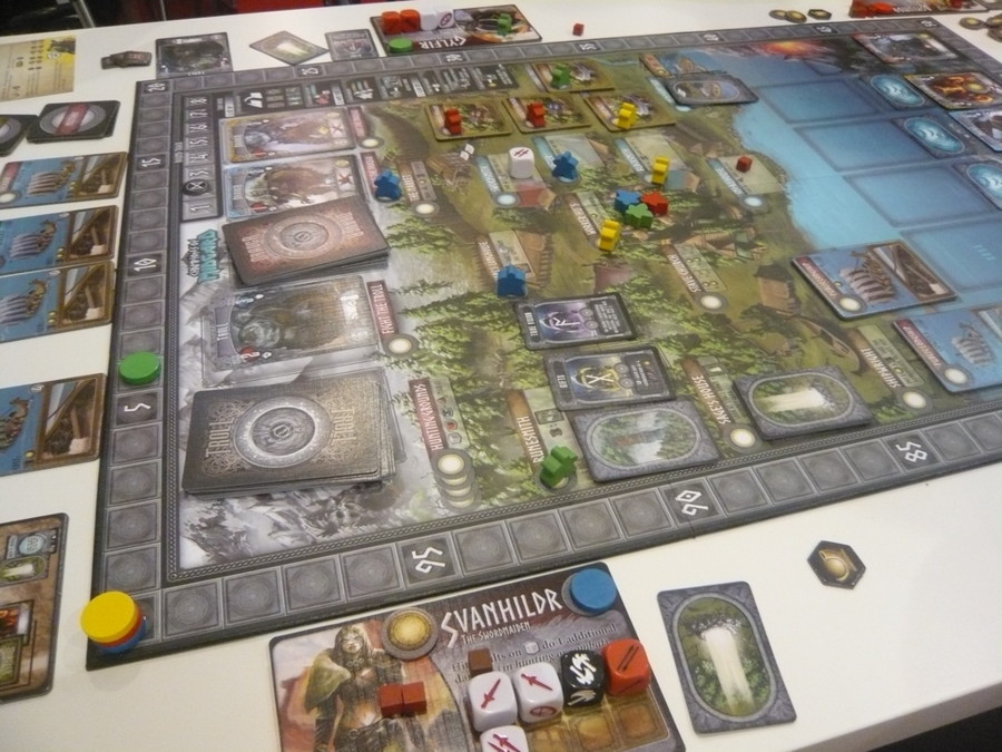 Este es un juego donde eres un héroe vikingo que debe hacerse renombre matando criaturas en los bosques o conquistando monstruos en lejanas tierras diseñado por el danés: Ole Steiness. Y no, no hablo de Lords of Water Deep. Para eso tienes que conseguir recursos, como lanceros, guerreros con hachas, o con espadas, pero también necesitas comida y madera y otros recursos. “No. No es Water Deep” Es un juego de posicionamiento de trabajadores que también cuenta una historia.