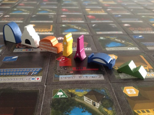 En el juego tienes una oferta, tipo Suburbia, pero acá pones los componentes de la ciudad en una cuadrícula de 5X5 en forma aleatoria. La forma de agarrar las losetas es por medio de una loseta de arquitecto, estas están numeradas de 1 a 4. Los pones en la parte de afuera de la cuadrícula en una columna o una fila y coges el que este en la posición del número del arquitecto que elegiste. Esta la pones en tu cuadrícula personal de 4X4 en la columna o fila que diga el arquitecto que utilizaste para conseguirla.