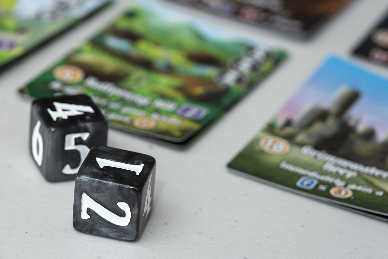 Acá tiras dos dados y puedes: Utilizar cada resultado individualmente (digamos tiro y saco un 5 y un 2, puedo activar las cartas con esos números) y puedes activar la suma de los dos números (también funciona como un 7)