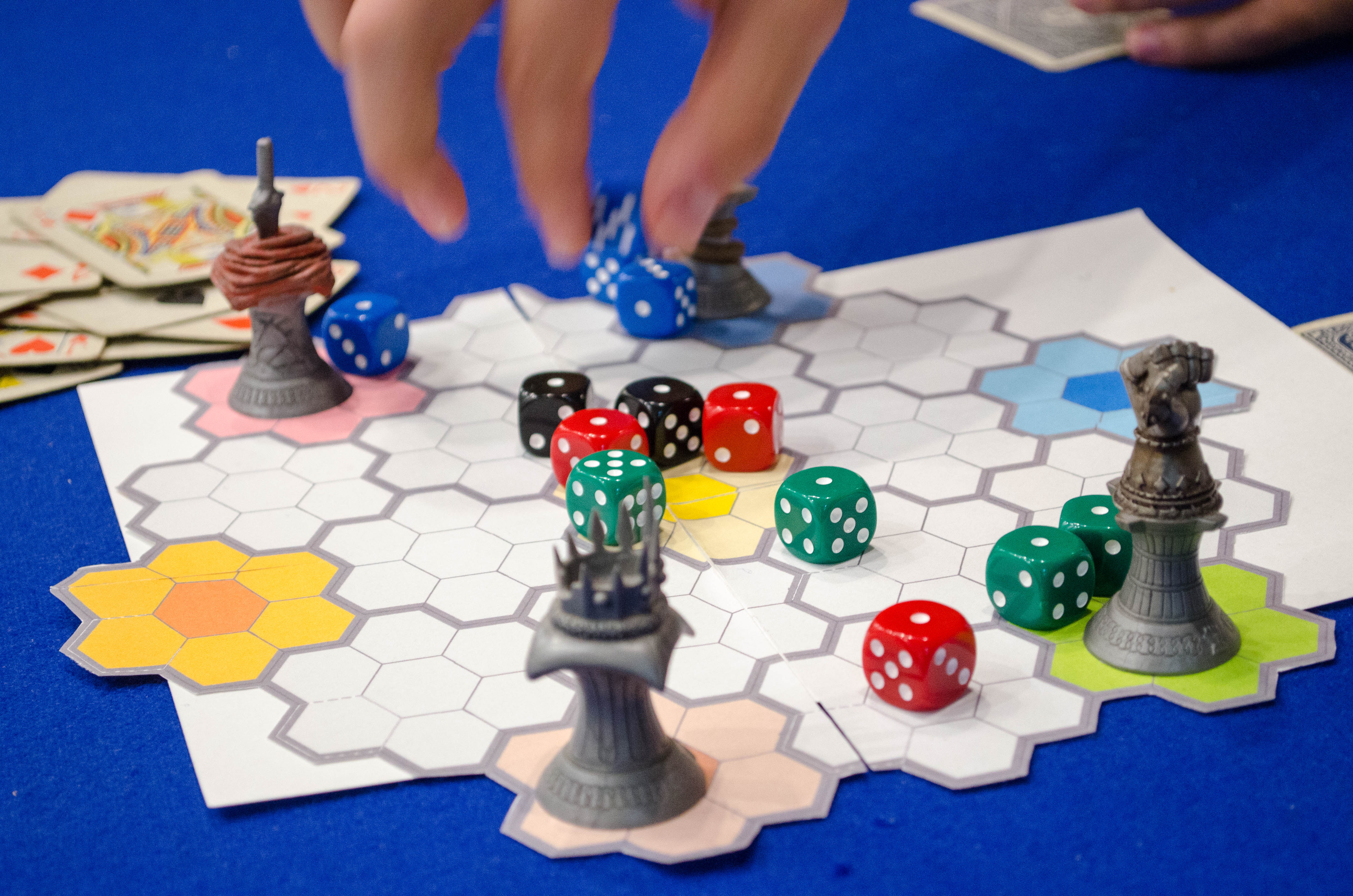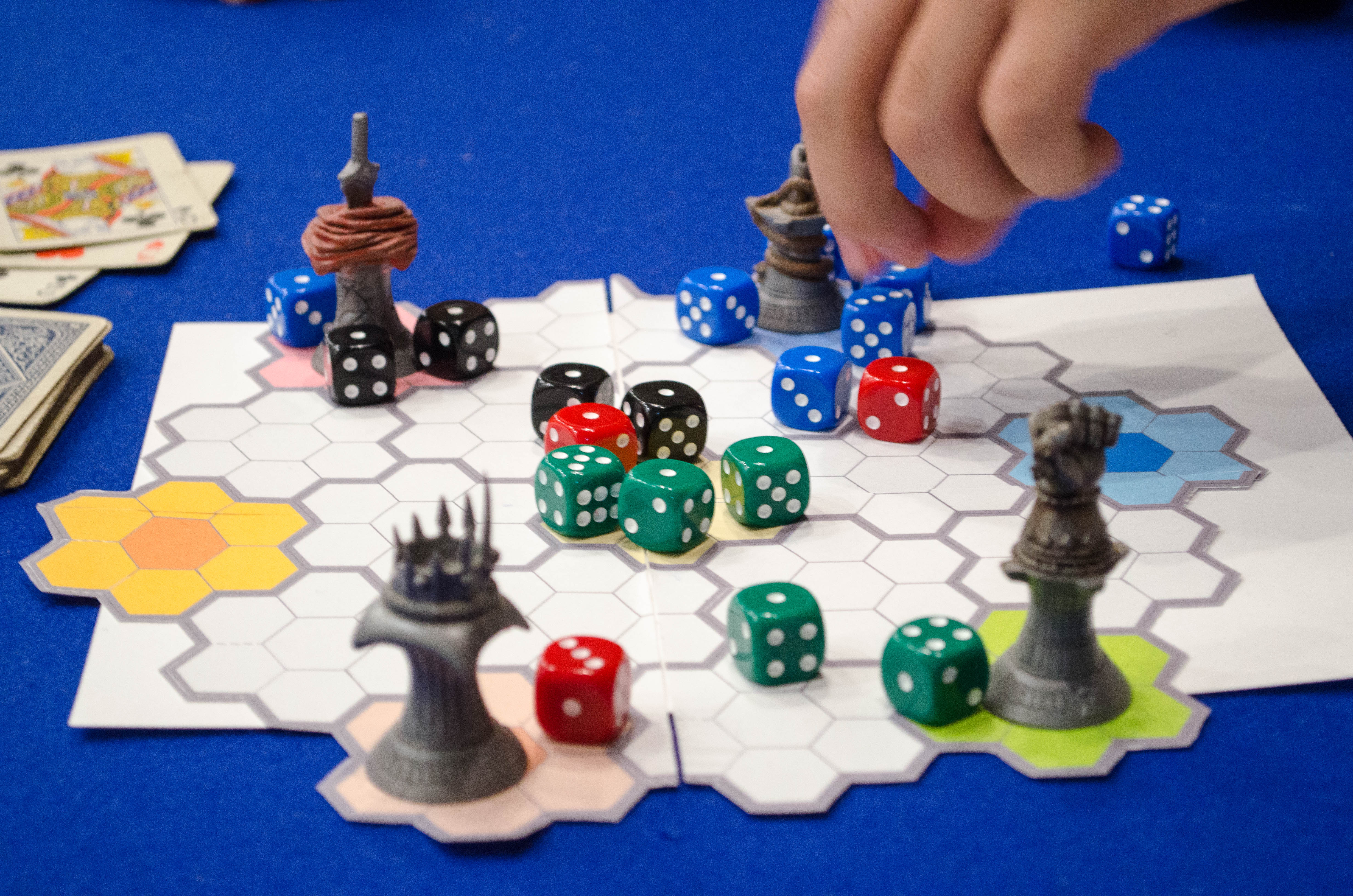 El impacto de las tropas a la hora de ocurrir una batalla (qué tanto daño hacen) está calculado por el número que enseñe el dado en su cara superior: si es uno es recluta, si enseña un 3 es arquero… y así sucesivamente. El combate se realiza agregando el valor de cartas (de una baraja francesa) al valor de daño que muestra el dado (los dados no se ruedan). Para ganar tienes que sitiar el territorio de otro jugador o el territorio central. Muy interesante, rápido.