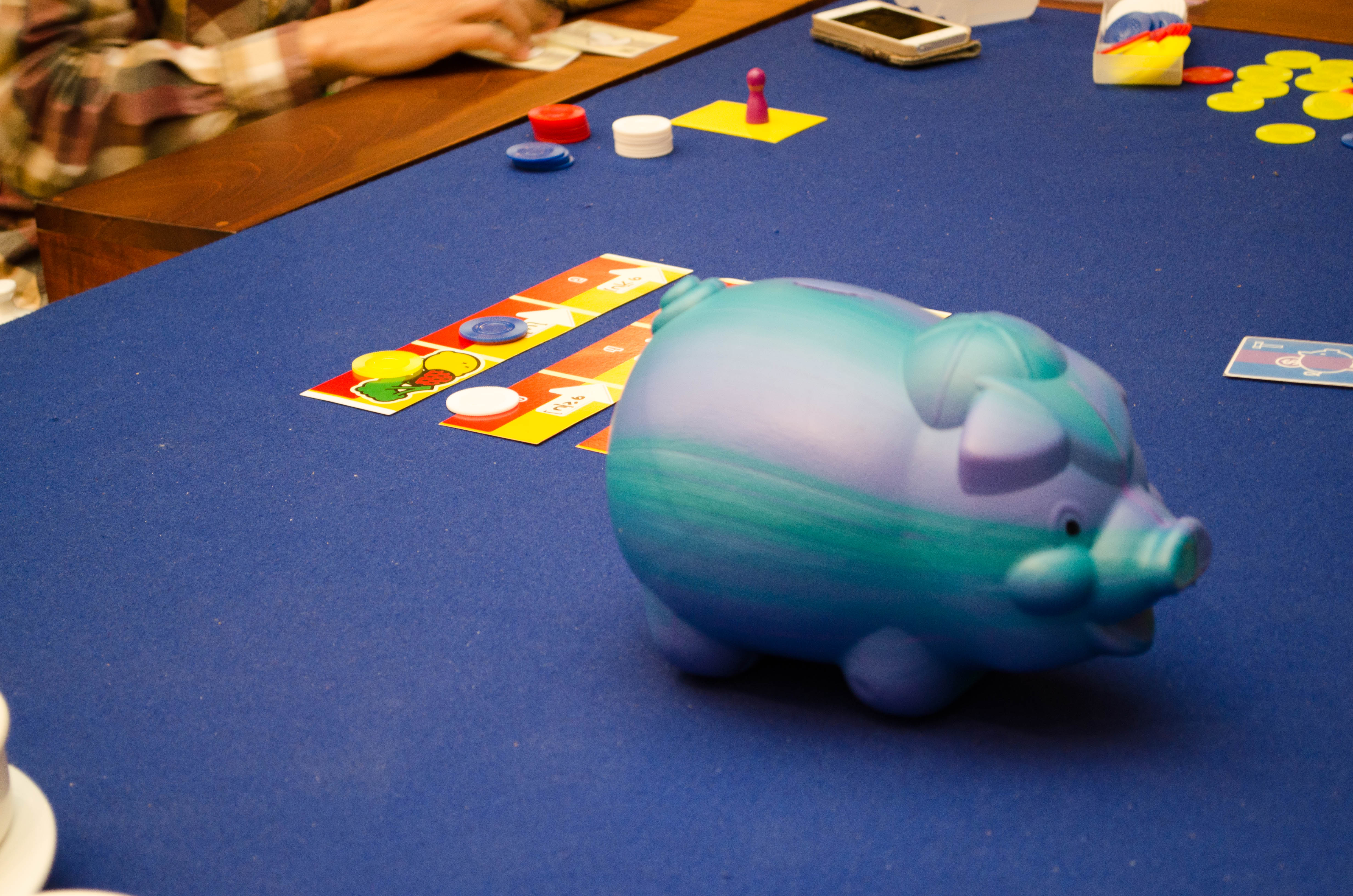 Cochito Alcancía tiene una muy interesante pista en donde se registra el valor que cada moneda tiene en todo momento. Cada vez que alguien compra un producto, la moneda utilizada para adquirirlo entra a circular en el mercado, el cual está simulado por el cochito. Entre más divisa haya de una sociedad, menos valen sus recursos. Esta es una simulación de Inflación y de cómo un especulador puede sacar ventaja analizando el mercado, muy al estilo del dicho: En río revuelto, ganan los políticos… digo ganan los pescadores. El juego fue bastante interesante, aunque para mí fue un poco difícil de entender.