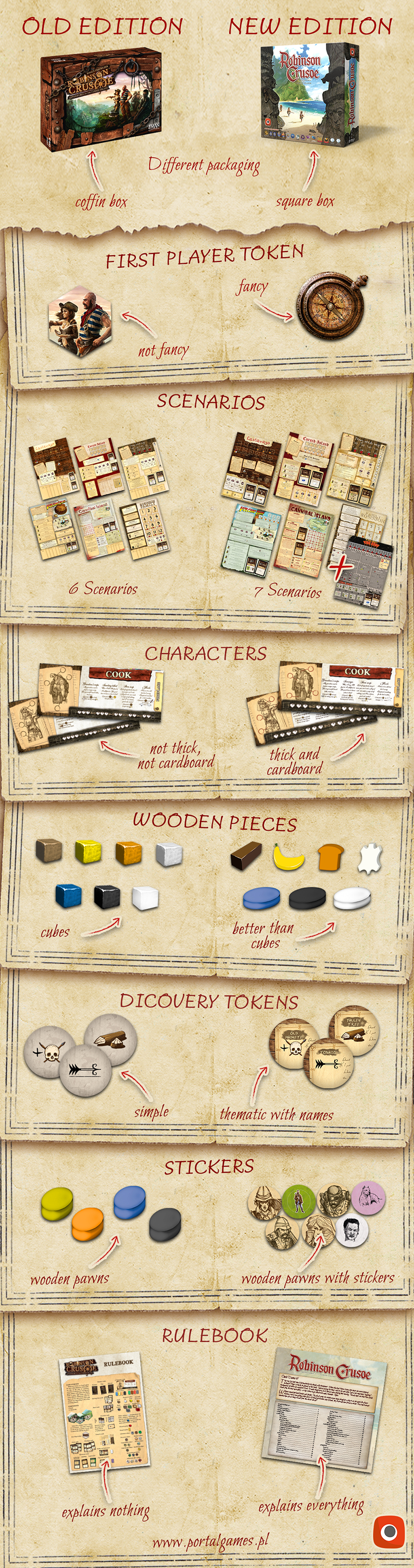 Hace unas semanas tuve la oportunidad de jugar la versión en español del juego Robinson Crusoe que un amigo mío compró en Chile. Y qué diferencia, los tableros más gruesos, los recursos en forma de lo que representan (aunque… eh, cuando cazas un pájaro, este te da comida en forma de bananas… eh… ¿Qué?), muy buen escenario extra. Entonces cuál fue mi sorpresa al saber que la nueva edición de este juego en inglés será mucho más parecida a la versión en español que la primera versión en inglés. El juego saldrá a la venta en todos lados en Noviembre del 2016. Acá esta, en una muy bonita infografía, los cambios de edición a edición: