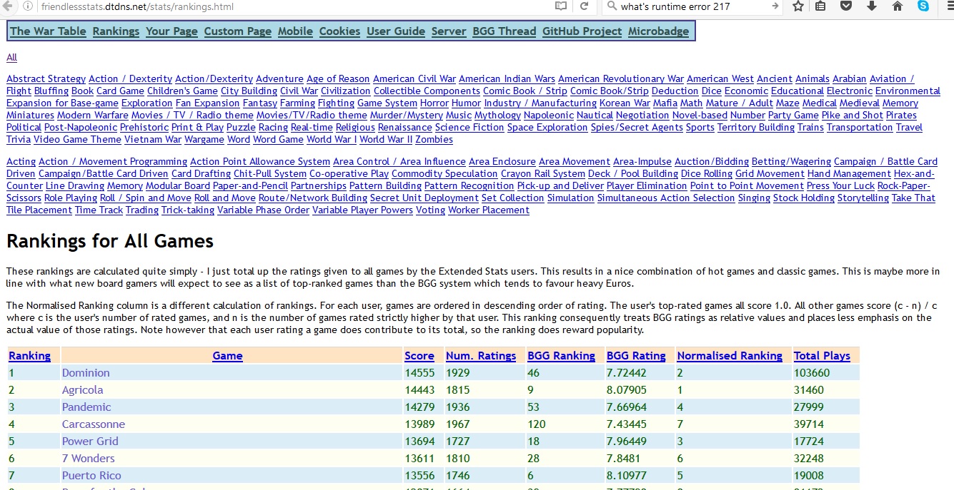 Este es un sitio que baja los datos contenidos en la base de BGG y los agrupa bajo varios criterios. Es suficiente para que un estadístico se sienta incómodamente emocionado. Para el resto de nosotros, en esta página puedes encontrar de una sola mirada qué es lo que le gusta a la gente puesto que tiene una lista alternativa de los mejores juegos que reflejan más los gustos de la comunidad actual. http://friendlessstats.dtdns.net/stats/rankings.html