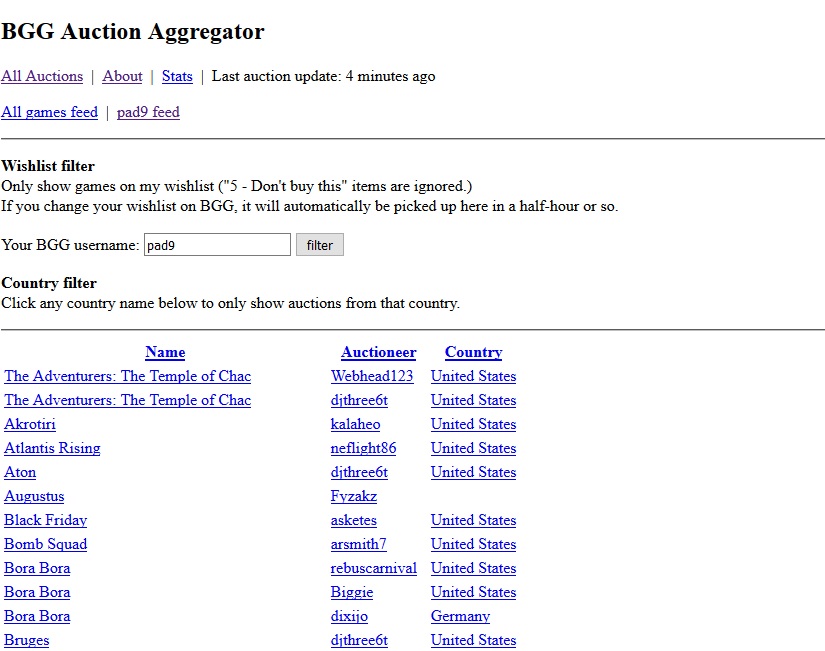 Este es un link en donde puedes poner tu usuario y el agregador te listará todas las entradas de subasta actual en la BGG que venda el juego que buscas. Utiliza tu Wishlist para generar un listado de los juegos que tienes en esa lista. Muy interesante y aunque tarda un poco y casi arruino mi botón de F5 por desesperado, vale la pena investigarlo. http://bggauctions.workingasintended.com/auctions