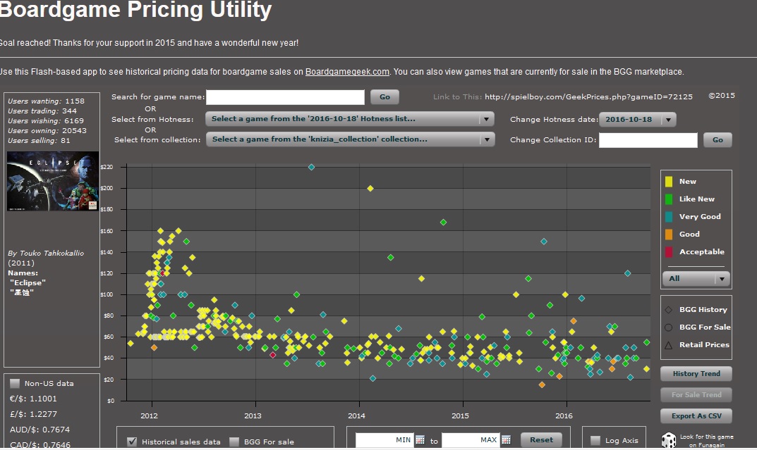 Esta siempre es una buena pregunta, y más después de que vendí mi copia de Bruxelles por centavos comparado con el precio del mercado. Y bueno, en este sitio puedes ver cuál a sido la fluctuación de los precios del juego que estas buscando o vendiendo a través de los años. Es una herramienta bastante conveniente. http://spielboy.com/GeekPrices.php?gameID=72125# Utiliza los datos de ventas de la BGG para crear la gráfica. El link que les dejé es el de Eclipse, puesto que las primeras veces que entré a la página no me funcionó. Una vez que utilicé el link de ese juego, todo funcionó bien.