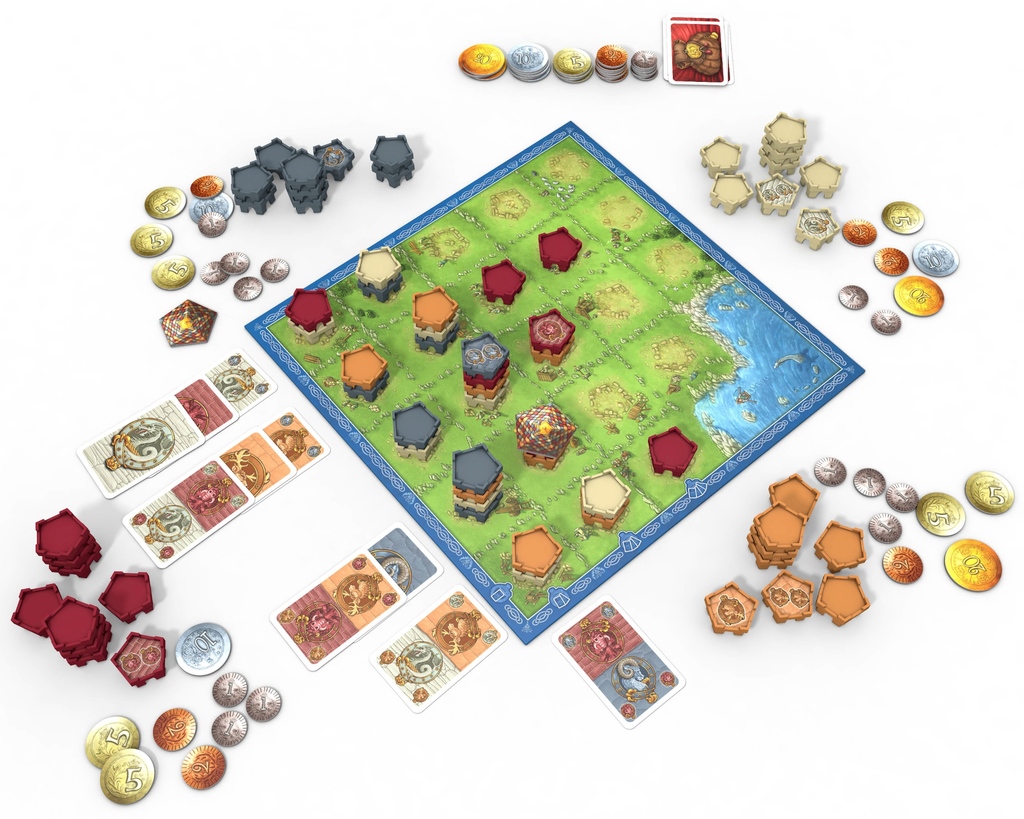 Y no importa el tema porque me parece bastante inteligente la forma de hacerlo. Como ya te habrás dedo cuenta este es un juego abstracto realmente. En él tienes un grupo de cartas arregladas en columnas bajo un tablero de cuadrícula. Cada jugador tiene un nivel de la torre en su color y pone en el tablero su pedazo de torre dependiendo de qué carta juegue.