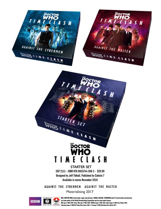 Super título para una super serie. El año pasado escribí una noticias de 2 líneas donde describía como la franquicia del doctor Who llegaba a la mesa de juego. Sólo para variar, se me pasó actualizar lo poco que sabíamos del juego, ahora… hehe vengo a anunciar que además de aquel juego base, ahora hay para que compres en un par de meses (marzo 2017 si estas apuntando). Primero me gustaría reportar de qué se trata el juego: Doctor Who timeclash: The base game es un juego para 2 a 4 personas en donde un lado toma el control del doctor y el otro de los Daleks. El juego viene con 3 arcos que forman un círculo, uno será del villano, otro de el acompañante y otro del tiempo. El objetivo del juego es poner cartas con diferentes números sobre los 3 diferentes arcos. Los malos tratarán de incrementar el número que se va acumulando con forme agregas cartas y los buenos pondrán cartas que disminuirán el número acumulado. Además de esto tendrás cartas especiales que te dejará cambiar el orden de las cartas en el montón acumulado en un arco, puedes también hacer que la carta de mayor valor o menor se quite del juego. Al final, el que haya logrado mantener la cantidad de su lado, números positivos o números negativos: Gana. Ahora Against the Cybermen y Against the Master agregará 48 cartas nuevas y nueve arcos adicionales.