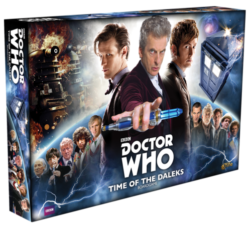 Nope, no me estoy quedando senil. En serio hay otro juego basado en la franquicia del Dr. Who. Esta vez viene de Gale Force 9 y Andrew Haught. Doctor who: Time of the Daleks parece ser una versión más encaminada a darte la sensación de que estas dentro de un episodio de la serie. Puesto que en este juego hay encuentros que los tienes que ganar (porque tu encarnas al Dr.) en contra de los enemigos del Dr. por medio de conseguir recursos. En este caso son dados que formarán una reserva de dónde podrás utilizar para poder superar pruebas. Pero no te apenes puesto que tienes a tu acompañante para que te ayude. El juego traerá minis (puesto que puedes jugar como uno de los dr. incluidos en la caja: el 1, 4, 5, 10, 11 y 12) no sólo de los doctores sino también de los Daleks y también de Davros mismo.