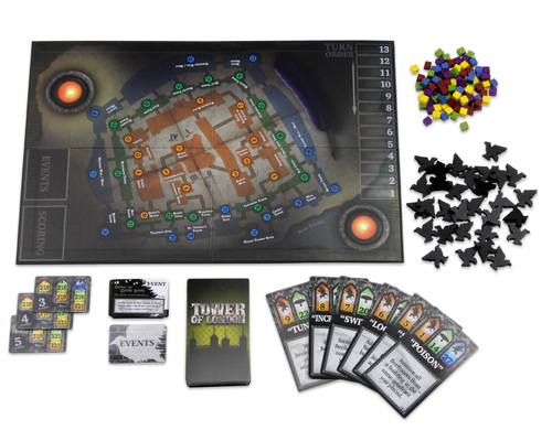 Ok, este es el nuevo juego de Wizkidz. El gameplay de Tower of London es un poquito difícil de comprender, pero esto es lo que yo entendí: Cada jugador quiere controlar edificios adyacentes a la torre de Londres. Esto se logra controlando más cuervos que los demás jugadores. Para controlar cuervos tienes que jugar una carta de guardia a una región del mapa otra que se activa sobre la carta de guardia que jugaste al principio. Al final de cada ronda se puntean las regiones del tablero y se determinan mayorías. El juego termina al final de 3 rondas o cuando alguien tenga 7 fichas de cuervos.