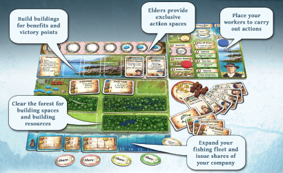 Desde hace tiempo (acorde a Eric Martin de la BGG) se rumoreaba que Uwe Rosenberg estaba diseñando un juego que tomaba lugar en el purisisimo norte. Y bueno, creo que los rumores resultaron ser ciertos. Nusfjord es el nuevo juego de Rosenberg de 1 a 5 jugadores (siempre es bueno que tenga juego solitario) y dura más o menos una hora y media. En Nusfjord tu y tus amigos son pescadores en el archipiélago de Lofoten al norte de Noruega (hehe, no, no es Lothlórien). Para ganar necesitas, obviamente salir a pescar pero eso no es todo, necesitas también agilizar tus finanzas para tener suficiente dinero para invertir. Por lo tanto tienes que poner en el mercado acciones de tu compañía pesquera. Esto significa que deberás compartir la pesca con tus accionistas. En el fondo el juego es típico Rosenberg, con posicionamiento de trabajadores, manejo de recursos… ahhhh… el verano en una caja…