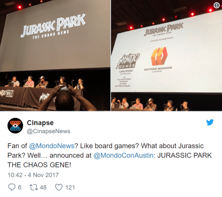 Hmmm… alguno de ustedes ha escuchado de una tienda de cosas de super héroes y demás que se llama Mondo? No? no… pus yo tampoco… pero al parecer tienen la licencia para producir un juego de Jurassic Park (este enlace es hacia Jurassic Outposts, no encontré el de la BGG). La semana pasada en su propia convención (al parecer si son algo importante) anunciaron que sacaran el juego con por lo menos 3 facciones que puedes jugar. Puedes ser 4 raptors, o la corporación, o los turistas. Hmmm… me muero de ganas de jugar con mi novia sólo para poder decir: “Clever girl…”
